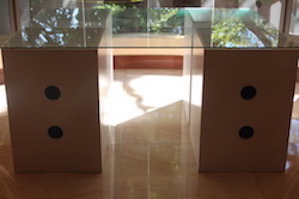 Our Glass tables have been custom made with the stands being cut from hand and carefully crafted to instil a retro yet slightly modernistic elegant feel that adds to the experience of viewing and pictures taken at any event with these tables present.